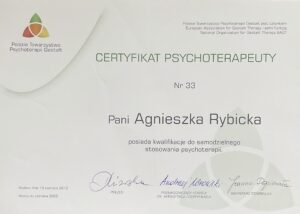 Posiadam certyfikat Psychoterapeuty wydany przez Polskie Towarzystwo Psychoterapii Gestalt.