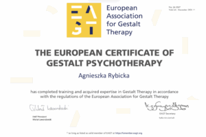 Ukończyłam szkolenie superwizyjne akredytowane przez EAGT (Europejskie Stowarzyszenie Psychoterapii Gestalt).